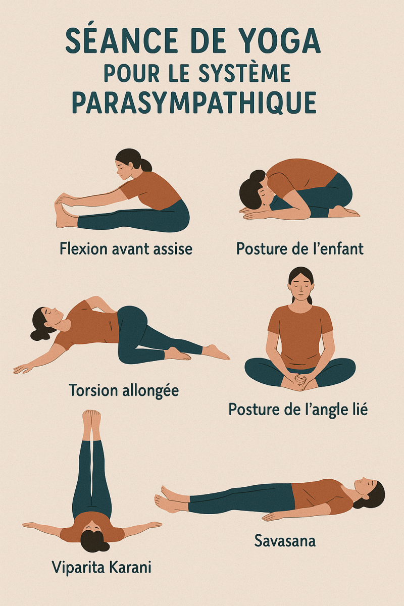 Certaines postures de yoga, douces et restauratives, ont la capacité d’activer ce système calmant. Elles favorisent le relâchement du diaphragme, la détente du système digestif, et permettent de sortir de l’état de "combat ou fuite" pour entrer dans celui de "repos et digestion".